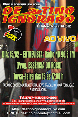 DESTINO IGNORADO estará nesta terça-feira DIA 15 de fevereiro de 2011 no programa "ESSÊNCIA DO ROCK" onde estará divulgando seu CD, falando dos shows, da trajetória e sobre sua nova formação.